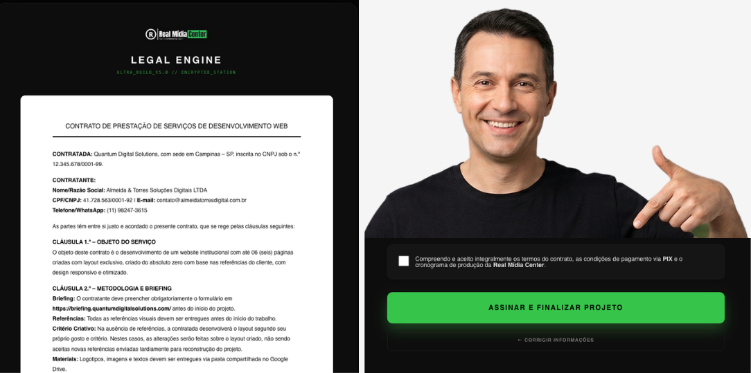 Desenvolvido pela Real Mídia Center, ele permite criar contratos dinâmicos, registrar evidências técnicas do aceite e armazenar documentos com segurança profissional diretamente dentro do WordPress.