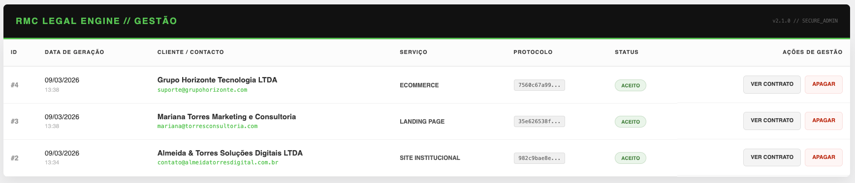 O RMC Legal Engine – Contratos Quantum é um sistema avançado de geração, registro e gestão de contratos digitais.